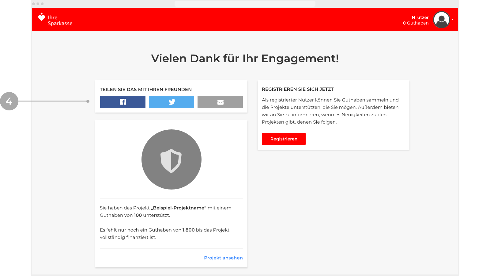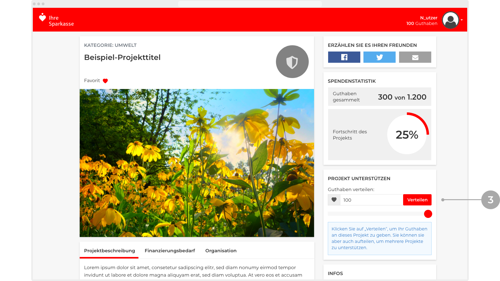 Hier können Sie nun Ihre Sparkassen-Taler verteilen. Geben Sie dazu in das Eingabefeld im Bereich „Projekt unterstützen“ die gewünschte Anzahl an Sparkassen-Talern ein und klicken Sie auf den Button „Verteilen“. Gerne können Sie Ihre Sparkassen-Taler auch auf mehrere Projekte aufteilen.