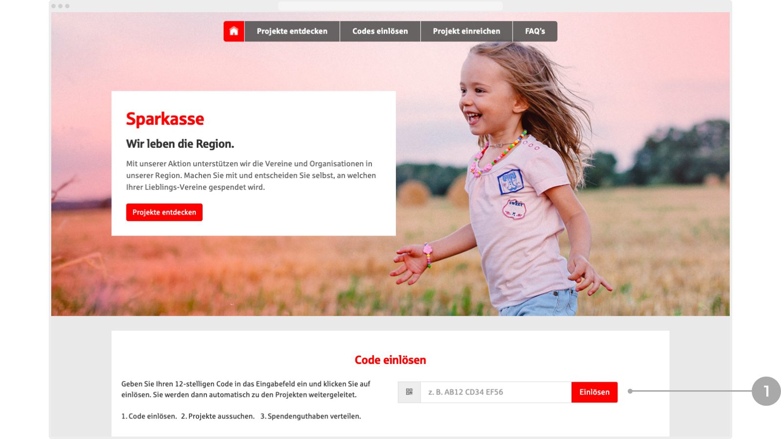 Geben Sie Ihren 12-stelligen Code in das Eingabefeld auf der Startseite ein. Mit Klick auf den „Einlösen“-Button werden Sie automatisch zur Projektübersichtsseite weitergeleitet.